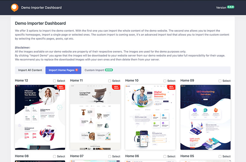 The theme has a new feature „Smart Demo Import”. At the moment we offer 3 options to import the demo content. With the first one you can import the whole content of the demo website. The second one allows you to import the specific homepages. The custom import is available now.